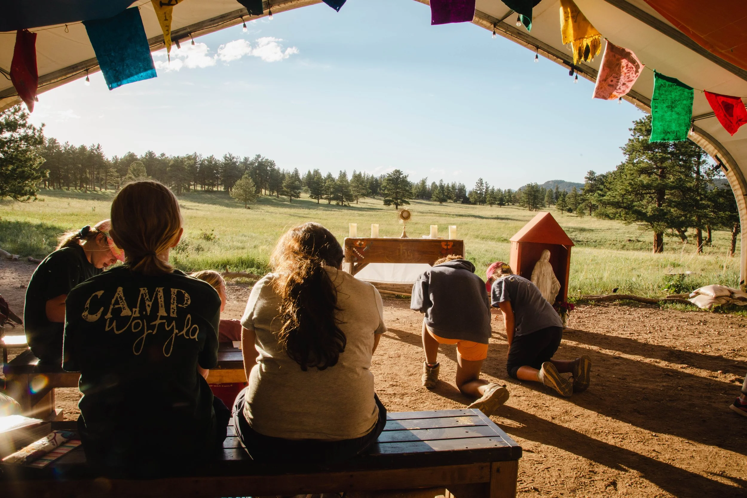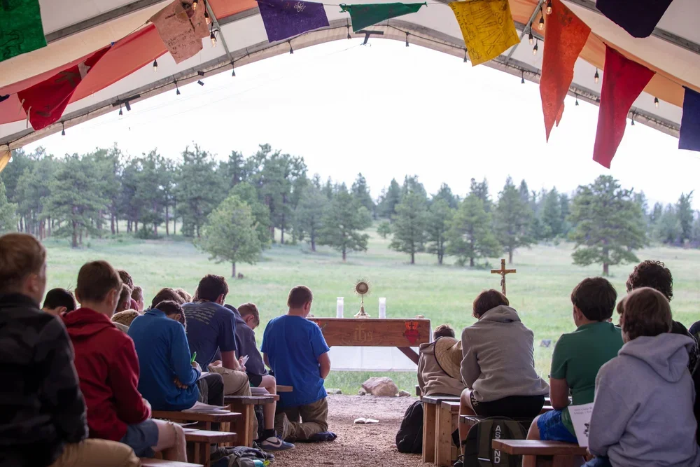 During the Wilderness Adventure Program on Camp Wojtyla’s 1,200 acre wilderness property, campers experience an intentionally crafted and sequenced program that seamlessly integrates adventure, faith, and formation. Middle school campers live jam-packed days of adventure. They learn to shoot a bow and arrow, fish in our pond, traverse through the trees on our highline course, and participate in a variety of challenges and competitions among teepee groups. Counselors debrief each activity to help campers draw lessons which they can take with them off the mountain. The joyful celebration of the sacraments, particularly the Eucharist, are the center of each day. Campers form Christ-centered friendships as they take on challenges, both personally and as a team. The evenings are filled with bonfires, night games, and time to pray and reflect on the day. Our goal is for campers to leave with a deep sense of God’s love for them and a desire to live life to the full in Jesus Christ!